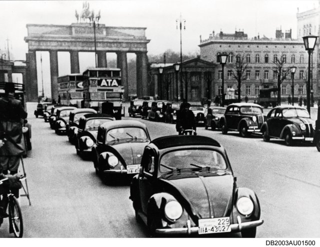 Wenige Jahre nach dem Krieg prägten VW Käfer das Straßenbild, wie hier in Berlin. Die Produktionsorte des VW KäfersWerk WolfsburgDas Werk Wolfsburg war das erste Werk, das Käfer herstellte. Die Grundsteinlegung erfolgte am 26. Mai 1938. Der Beginn des Zweiten Weltkriegs verhinderte jedoch die geplante Produktion des Käfers. Während des Krieges wurden hier Kübelwagen, Schwimmwagen und andere Waffen hergestellt. Erst nach dem Krieg, in der zweiten Hälfte des Jahres 1945, begann die Käfer-Produktion, zunächst in sehr kleinem Maßstab. Am 1. Juli 1974 um 11.19 Uhr rollte der letzte der 11.916.519 Käfer im Stammwerk Wolfsburg vom Band.