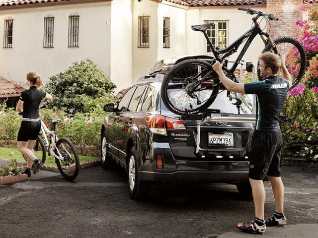 Für Heckklappenträger muss man kräftig sein - Bild: Thule Heckträger für Fahrräder, die auf die Anhängerkupplung montiert werden, gibt es in verschiedenen Varianten für 2 – 4 Räder, für herkömmliche Räder und für E-Bikes und Pedelecs. Bei modernene Heckträgersystemen lässt sich auch die Heckklappe öffnen, weil, der Träger samt Rädern nach hinten gekippt werden kann. Heckträger für Fahrräder sind noch immer die beste Lösung, weil sie die Räder am sichersten transportieren. Dies haben auch Crashtests in der Vergangenheit bewiesen. Eine Anhängerkupplung sollte man deshalb vielleicht bereits bei der Planung für den nächsten Autokauf mit einbeziehen oder eine Anhängerkupplung nachrüsten. Gute Heckträger liegen zwischen 350 und 450 €.